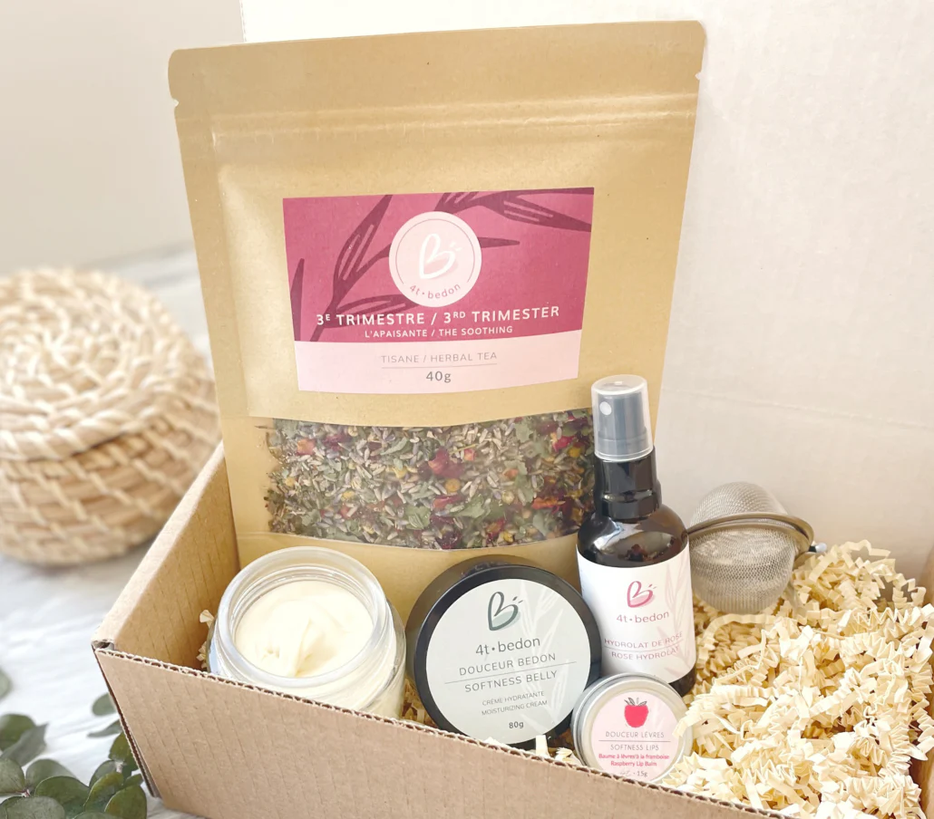 • Une tisane au choix – Chaque trimestre a sa tisane! Elles ont été conçues pour répondre aux besoins propres aux différents trimestres de la grossesse, mais sont toutes aussi délicieuses une fois bébé arrivé, s’il en reste!