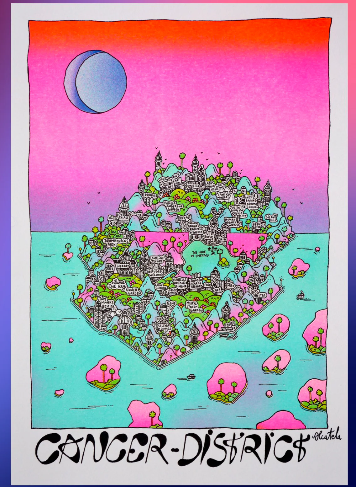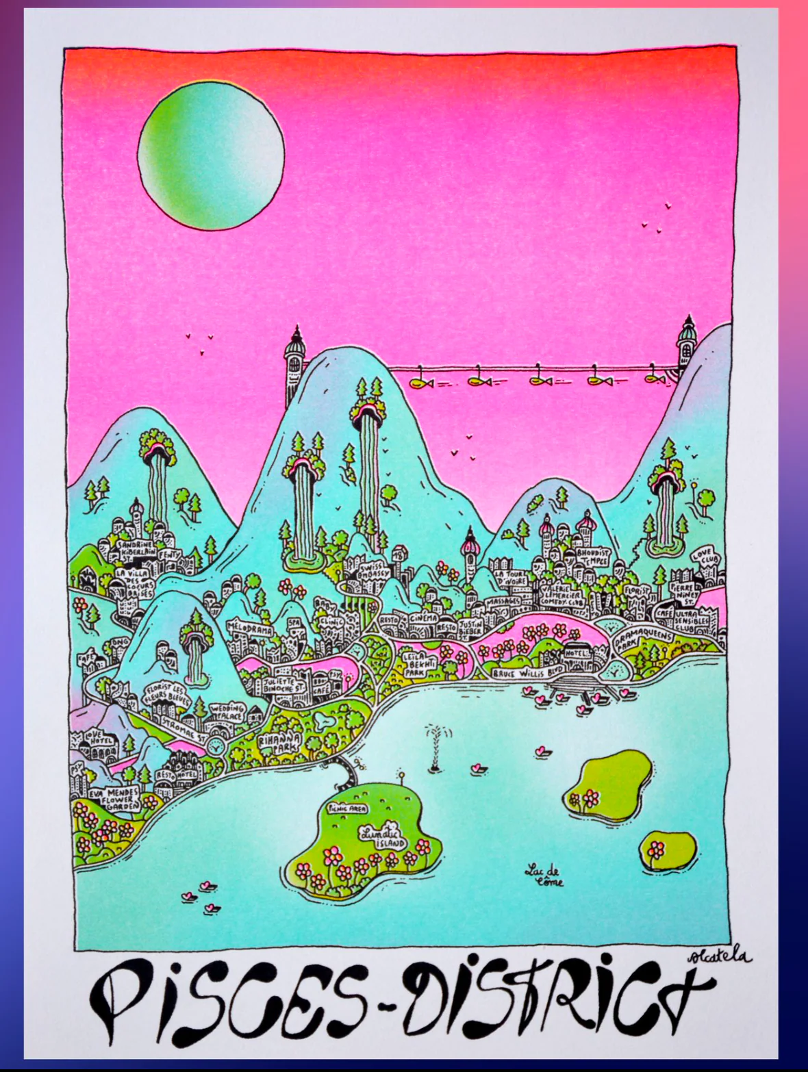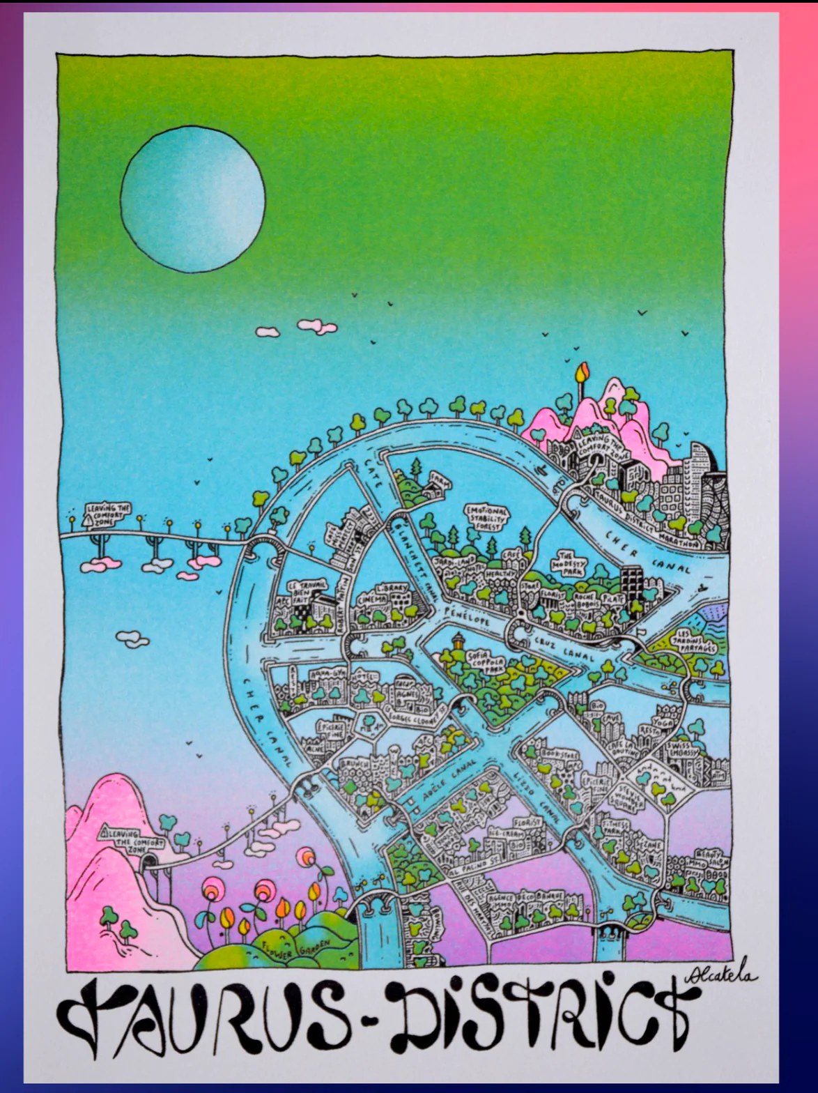 DISTRICT est une illustration réalisée en novembre 2023 dans le cadre de la série ASTRO-CITY. Pour cette série, il a été décidé de représenter chaque signe astrologique à travers la cartographie illustrée. En s’inspirant des signes distinctifs de chaque signes astrologiques, ces cartes ont vu le jour !