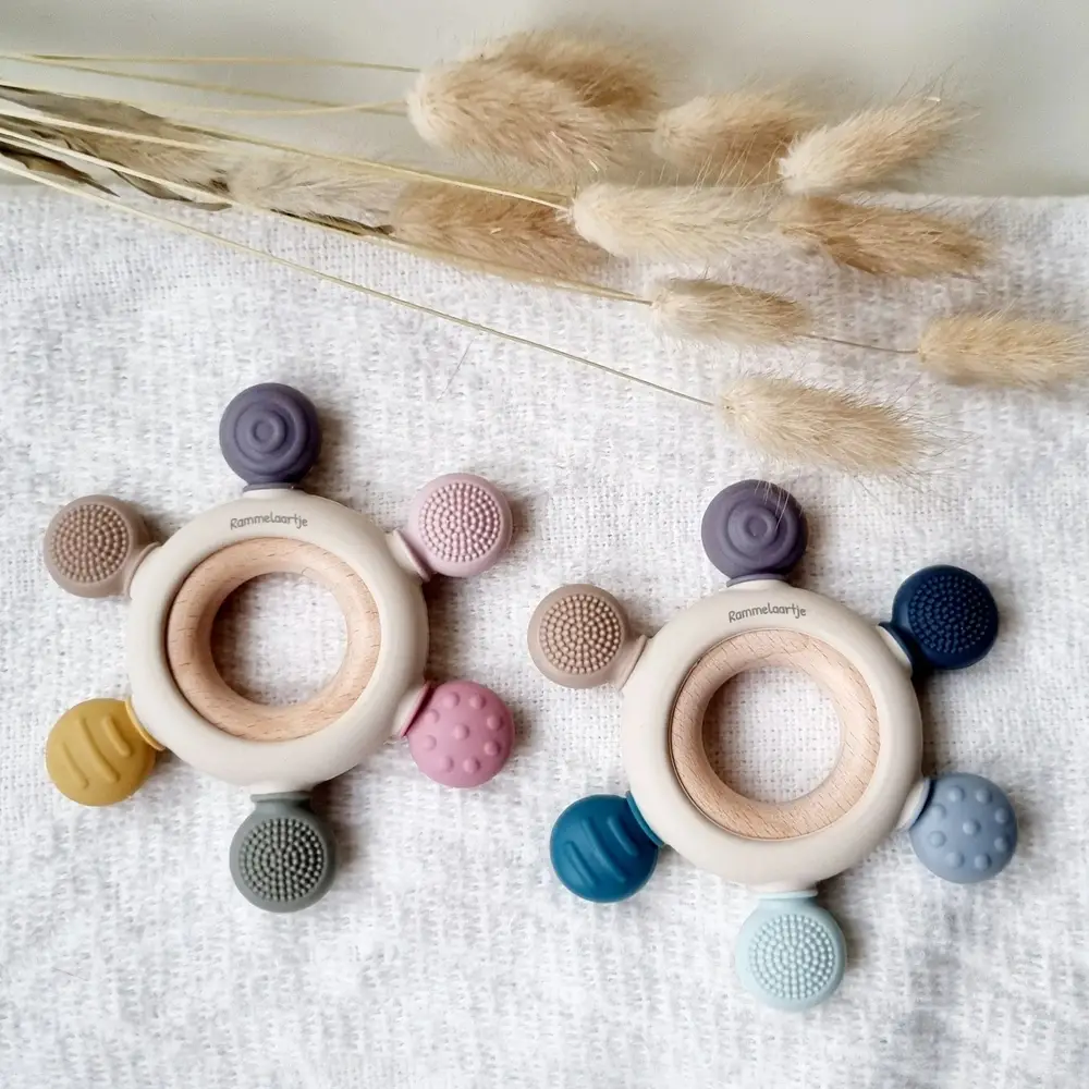 Cet anneau de dentition robuste est vraiment indispensable ! Il est composé d’un anneau en bois de hêtre et d’un silicone 100 % sûr pour les bébés. Il est donc flexible, facile à saisir et très agréable à mordre. Le relief permet de maintenir l’intérêt et de masser les gencives.