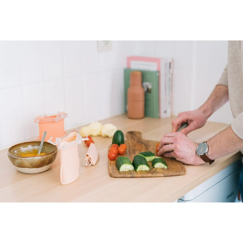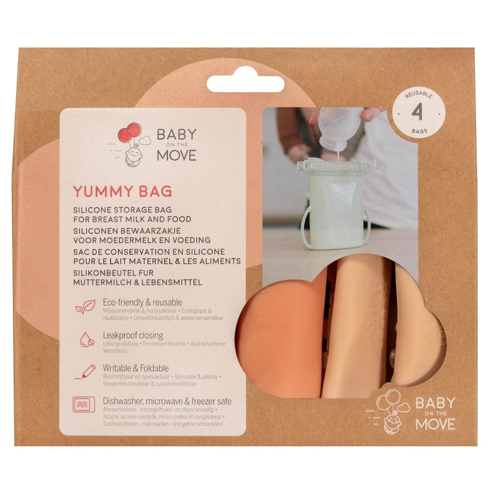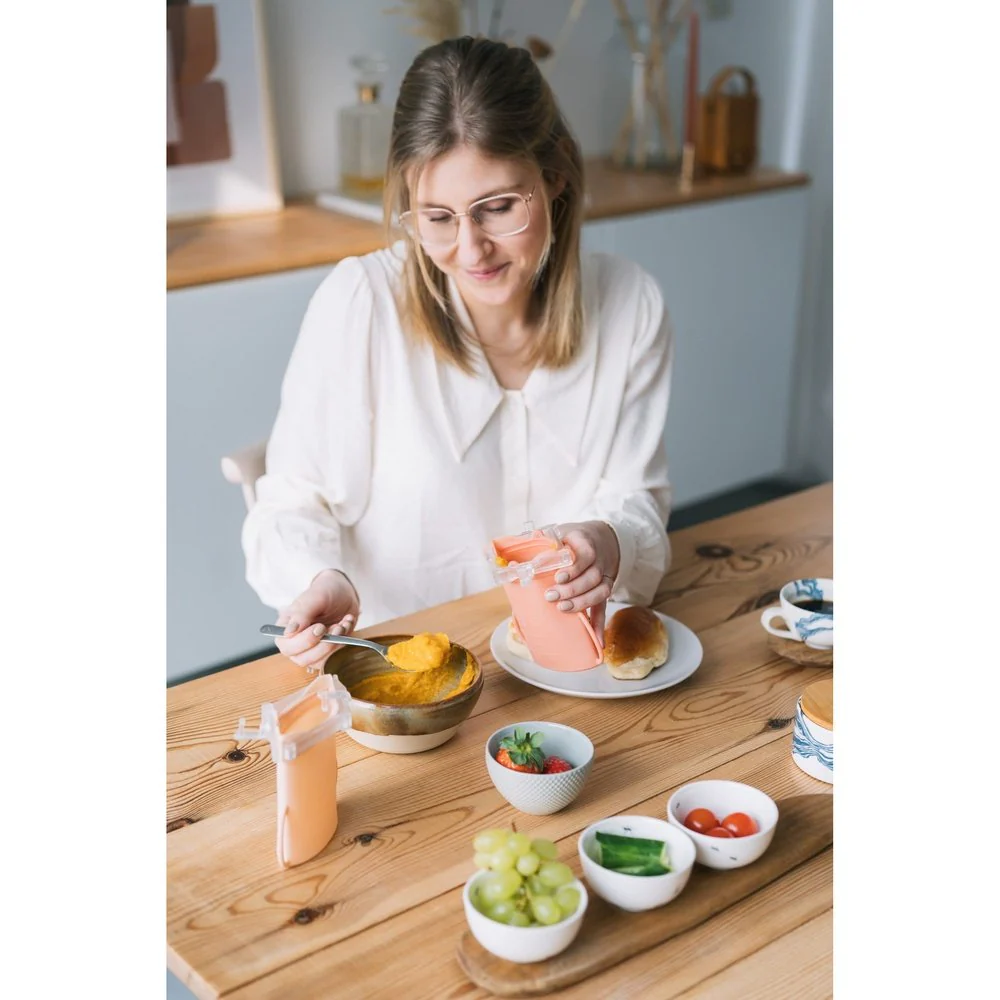 comprend 4 sacs de conservation en silicone élégants (2x Blush & 2x Bloom) de 180 ml chacun. Parfait pourlait maternel, aliments pour bébés en purée, collations ou petits repasà conserver, à congeler ou à emporter.