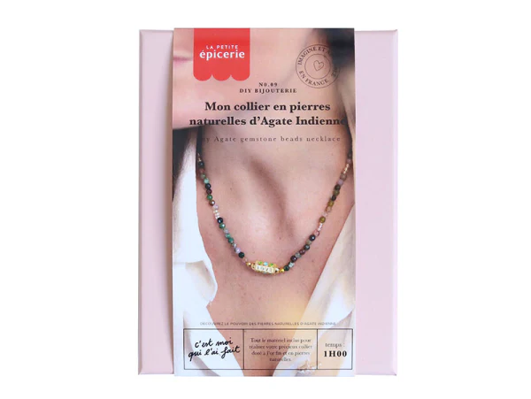 Vous avez envie de tester la tendance des bijoux en perles naturelles ? Vous adorer le DIY ? Ce kit MKMI : Mon collier en pierres naturelles d’Agate Indienne de la Petite Épicerie est fait pour vous ! Grâce à ce tout nouveau kit, vous aurez la possibilité de donner vie à une création tendance et colorée à porter au quotidien pour accessoiriser votre tenue. La Petite Épicerie a pensé à tout et vous fourni un livret explicatif pour réaliser étape par étape ce bijou en perles d’Agate Indienne de couleur verte. Après seulement 1 heure de création, vous aurez la satisfaction d’avoir un beau bijou prêt à être porté ! Parfait pour ceux et celles qui ne désirent pas passer des jours pour faire un DIY.