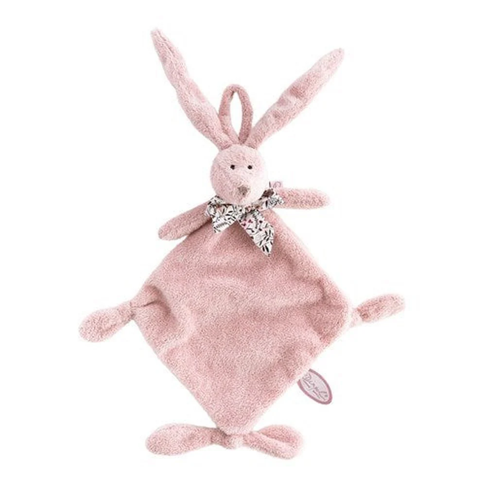 Flo le lapin Petit doudou avec boucle pour l’attacher à la tétine.Couleur : rose chaud avec nœud Liberty fleuri.Taille : hauteur 25 cm