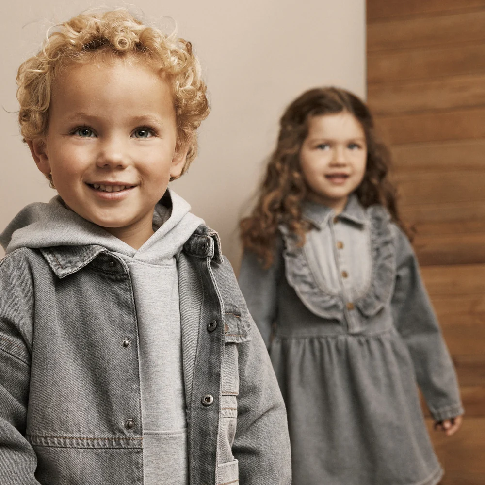 Robe en denim EN FANT, à la fois cool et élégante, à manches longues et dans un joli gris. Le col classique, les boutons et les jolis volants la rendent parfaite. Adorable et cool à la fois, prête pour toutes les aventures !
