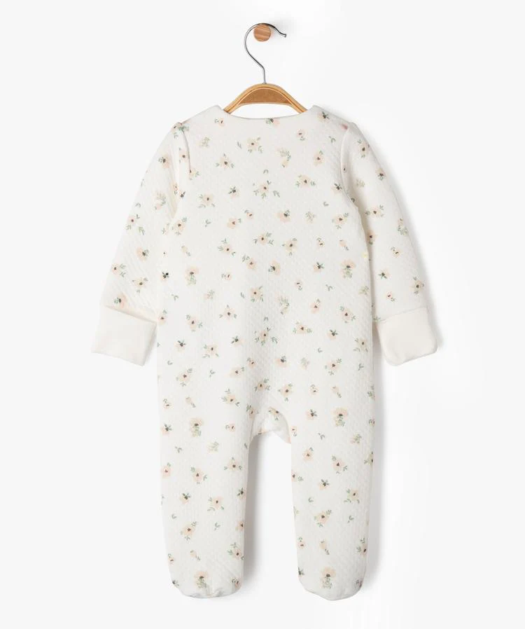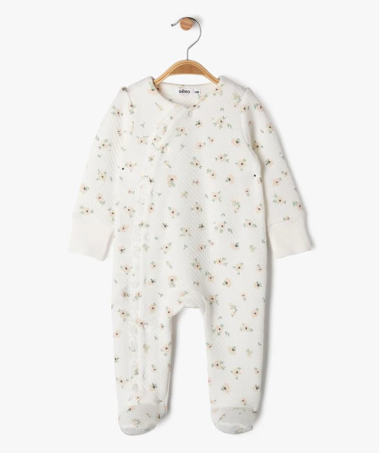 Équipez votre bébé avec cet ensemble bébé 3 pièces alliant confort et praticité. Le trousseau de layette se compose d’un pyjama dors-bien, d’un body manches longues et d’un bavoir, tout en coton. Le pyjama en molleton gaufré fleuri, entièrement pressionné devant, est agrémenté d’un joli volant au niveau de la fermeture. Pratique, il est équipé de moufles intégrées dans les manches pour garder les petites mains bien au chaud et éviter les griffures. Le body à manches longues en coton délicatement ajouré, est orné d’un petit print sur la poitrine. Il assure un confort optimal à votre enfant, un change et un habillage faciles grâce à ses boutons-pression devant et à l’entrejambe. Le bavoir en jersey de coton, grand format, se fixe facilement avec une pression sur le côté du cou, parfait pour les repas.