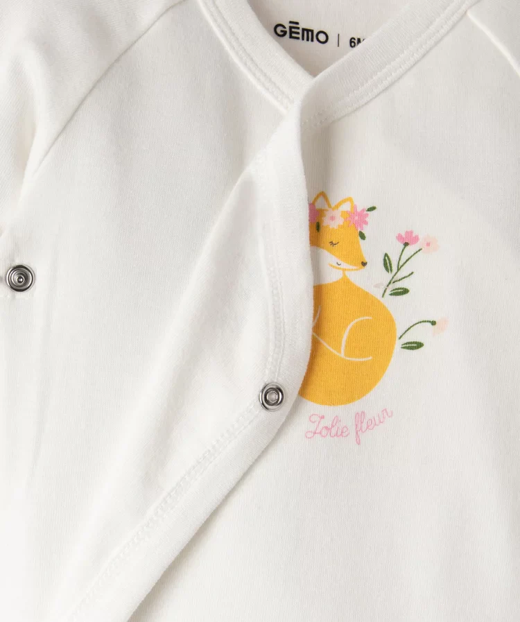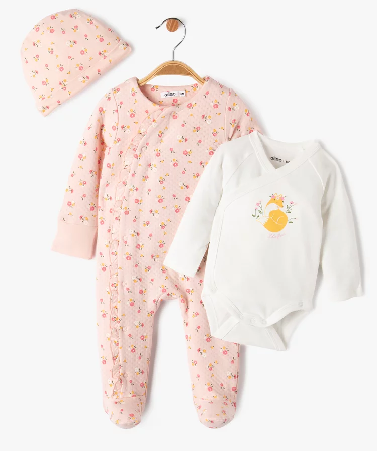 Un ensemble layette idéal pour les premiers mois de bébé et particulièrement craquant avec ses motifs fleuris sur le sur-pyjama et le bonnet, et son petit renard sur l’avant du body. Une excellente idée de cadeau de naissance.