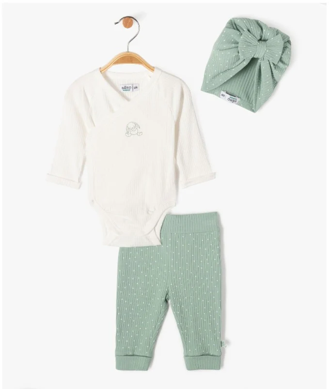 Kit naissance évolutif 3pièces:body ML,pantalon et bonnet blanc et vert d’eau