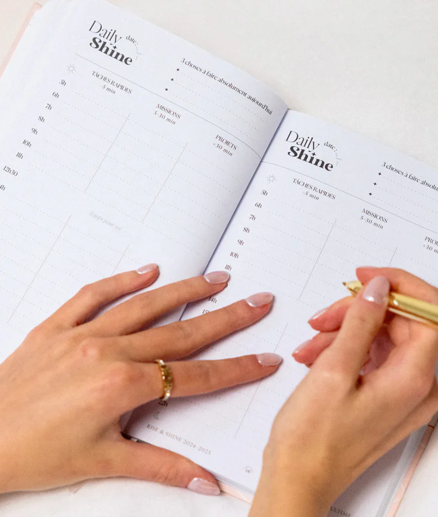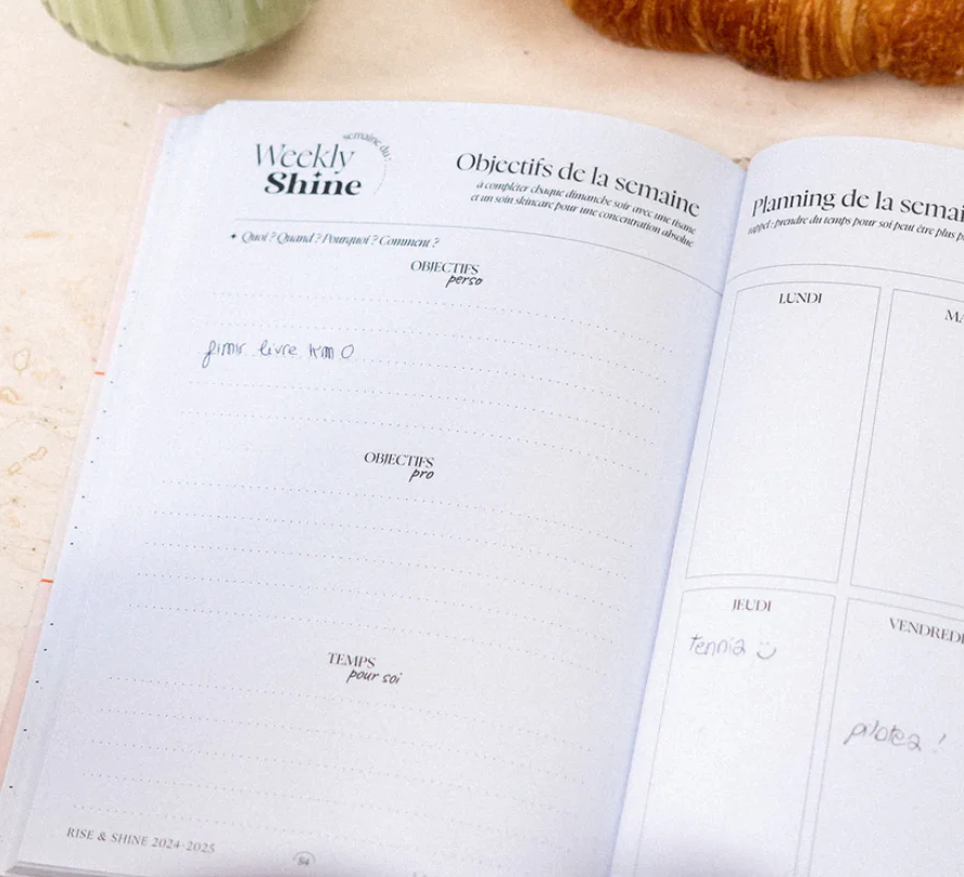 Cet agenda non-daté a été conçu pour organiser tous les aspects de notre vie dans un seul et même carnet, trouver l’équilibre pro/perso au quotidien et rester motivés grâce à la méthode ✨Rise&Shine✨