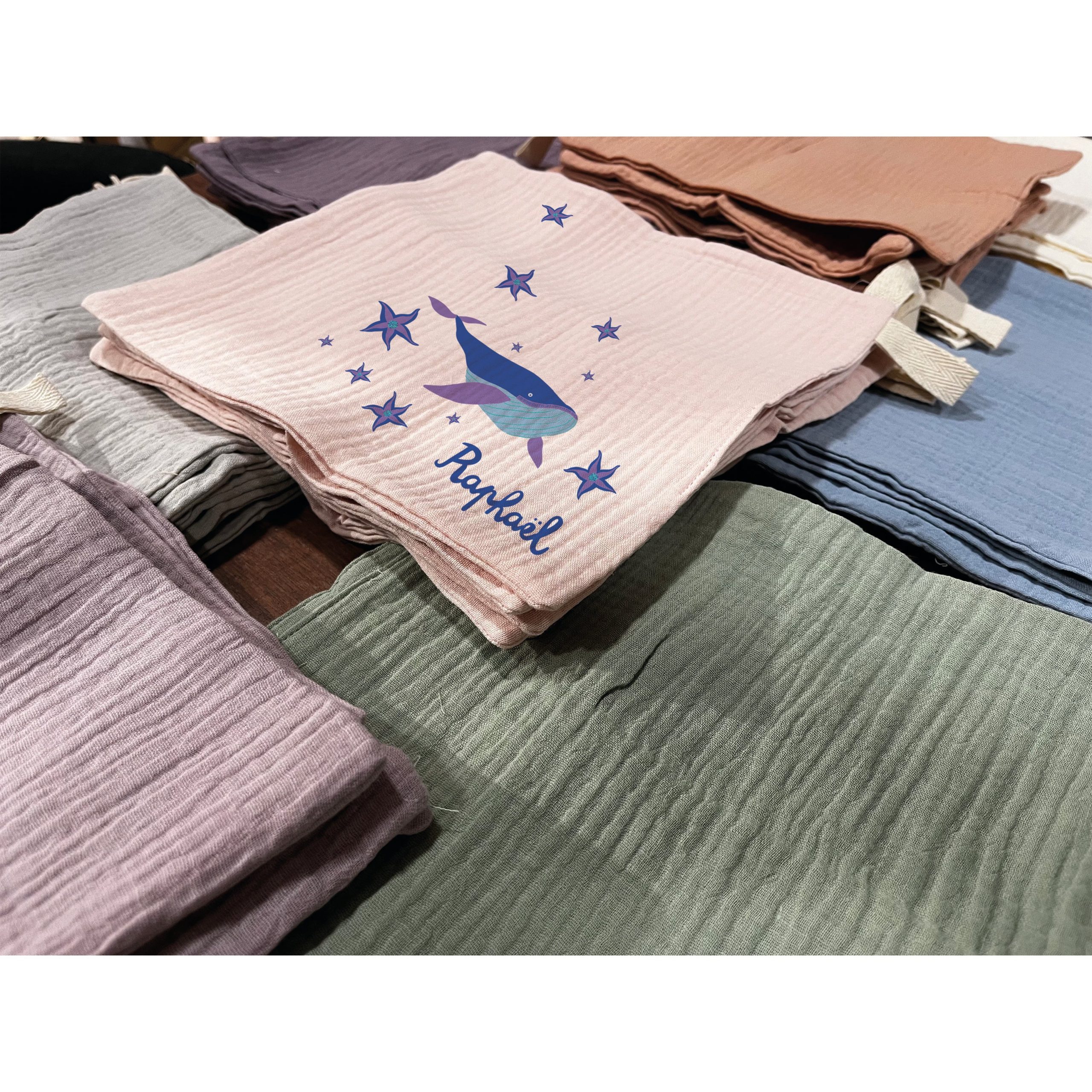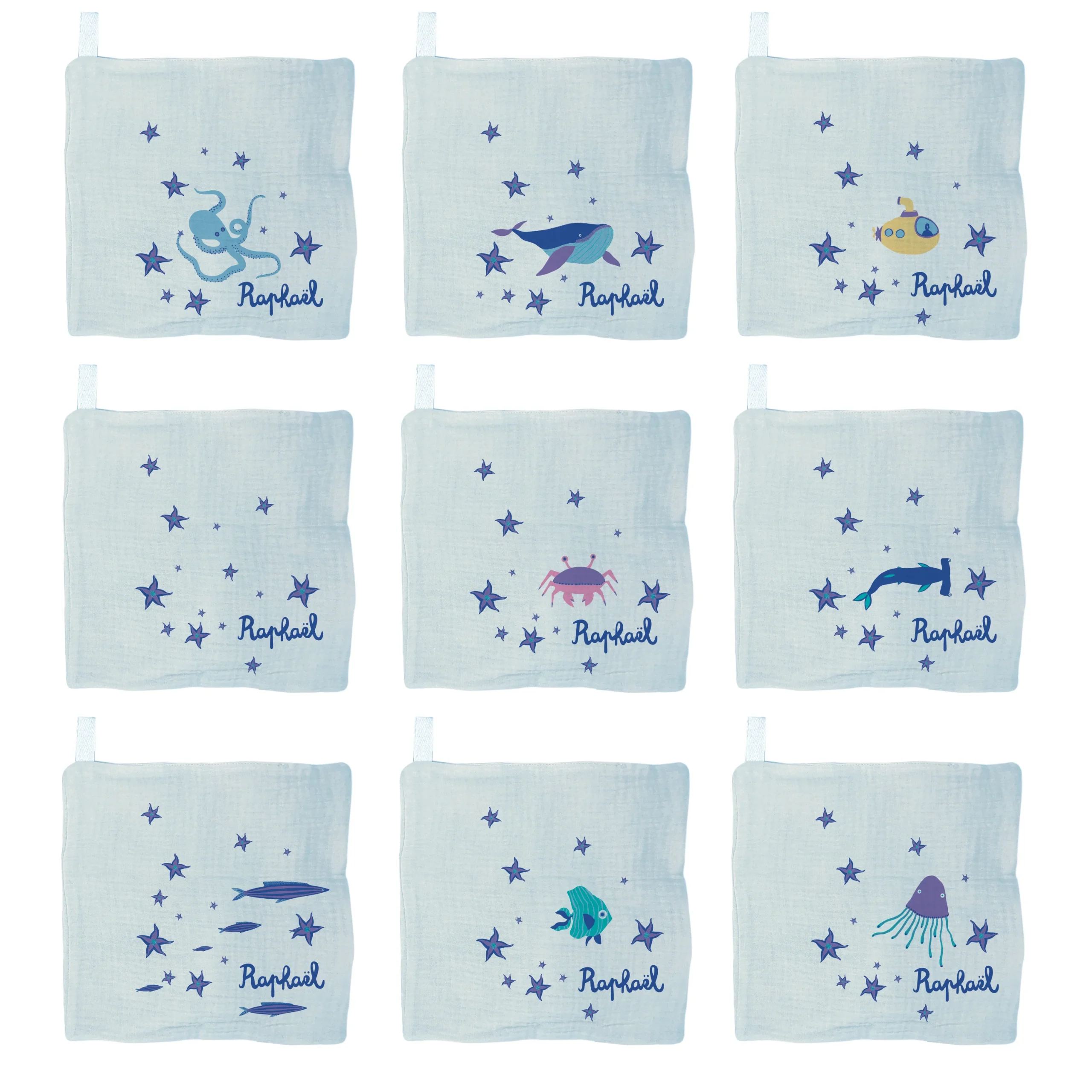 Pour la naissance du petit dernier, ou l’anniversaire du premier, offrez un peu de bonheur avec ce lange personnalisable au prénom de votre choix. Un lange 100% coton sur le thème de la mer, des poissons et ce qu’il s’y passe en dessous.
