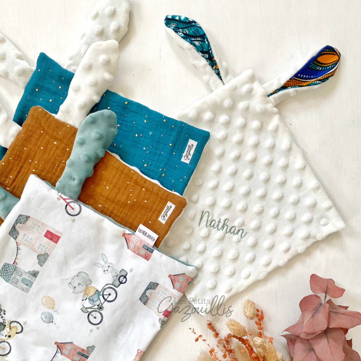 Découvrez le Lapinou, il est tout doux et peut être assortis à la couverture personnalisée de bébé. Parfait en cadeau de naissance, et petit budget !