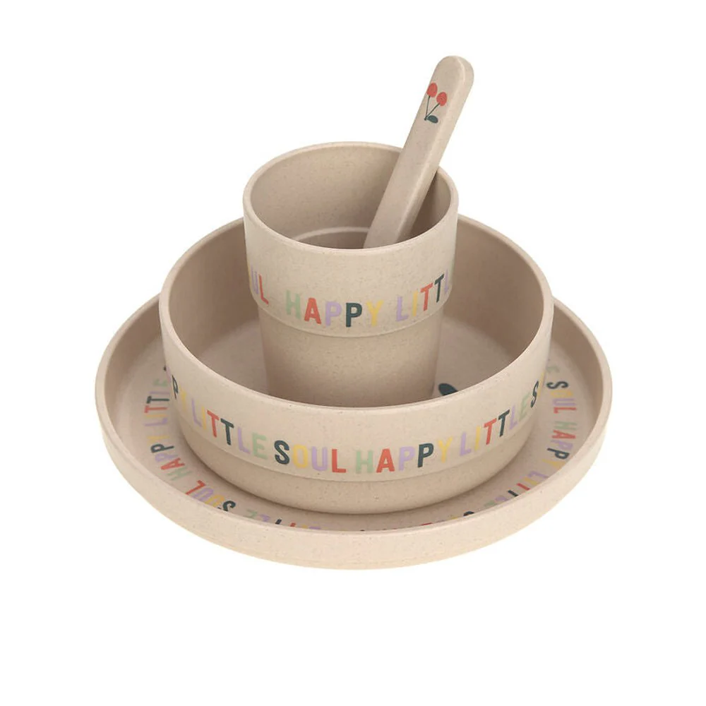 Le set comprend une assiette, un petit bol, une tasse et une cuillère. L’anneau antidérapant au bas de la vaisselle assure une meilleure prise sur la table.