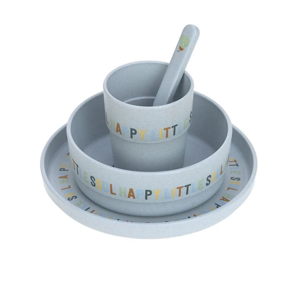 Le set comprend une assiette, un petit bol, une tasse et une cuillère. L’anneau antidérapant au bas de la vaisselle assure une meilleure prise sur la table.