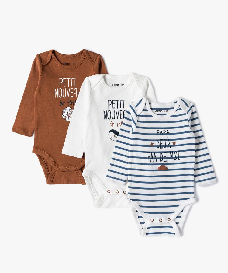 Ce lot de sous-vêtements bébé trouvera sa place dans le dressing de votre enfant. Un lot de bodies bébé garçon qui surfe sur la tendance éco-responsable avec sa composition 100% coton biologique et ses charmants motifs sur le buste. Des bodies à manches longues qui enveloppent bébé de douceur et lui assurent un maximum de confort sous tous ses vêtements. Des bodies avec encolure américaine et pressions à l’entrejambe pour faciliter l’habillage et le change. Ce lot se compose d’un modèle rayé, et de deux avec inscription et motif sur l’avant.