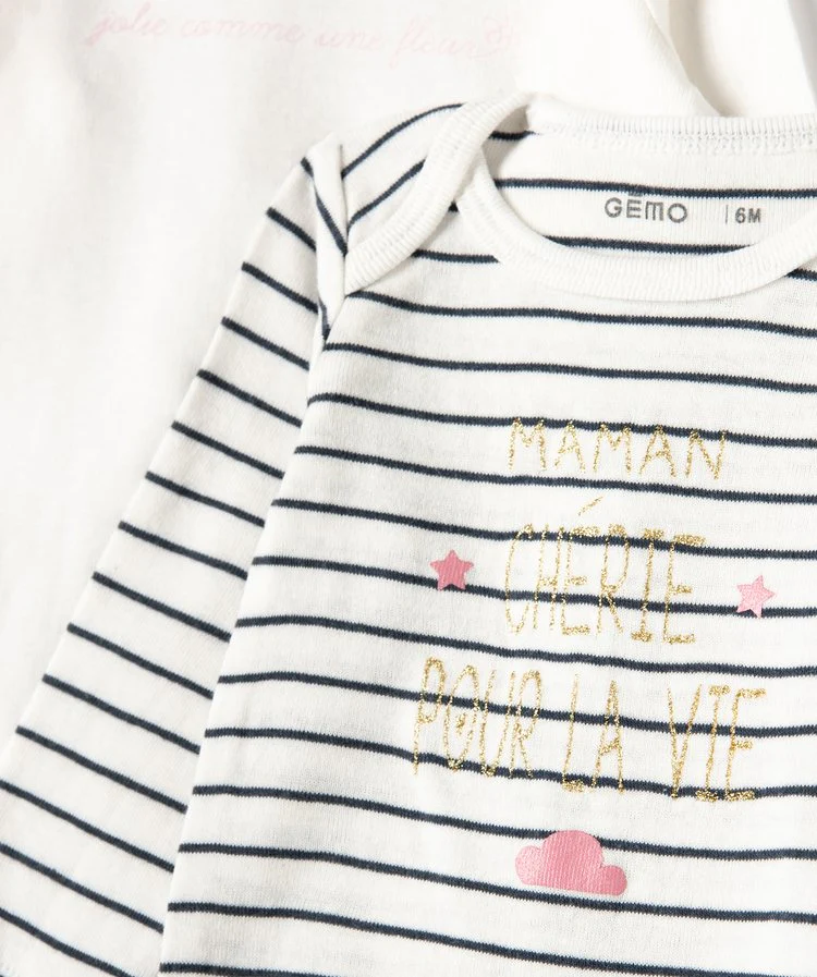 Lot de 3 bodys ML, noir, blanc et rose MARQUE : GÉMO Succombez à la douceur de ces sous-vêtements bébé en coton biologique. Un lot de 3 bodies bébé fille qui assureront une parfaite protection sous tous les vêtements. Ces bodies à manches longues possèdent une encolure américaine offrant une large ouverture pour le passage […]