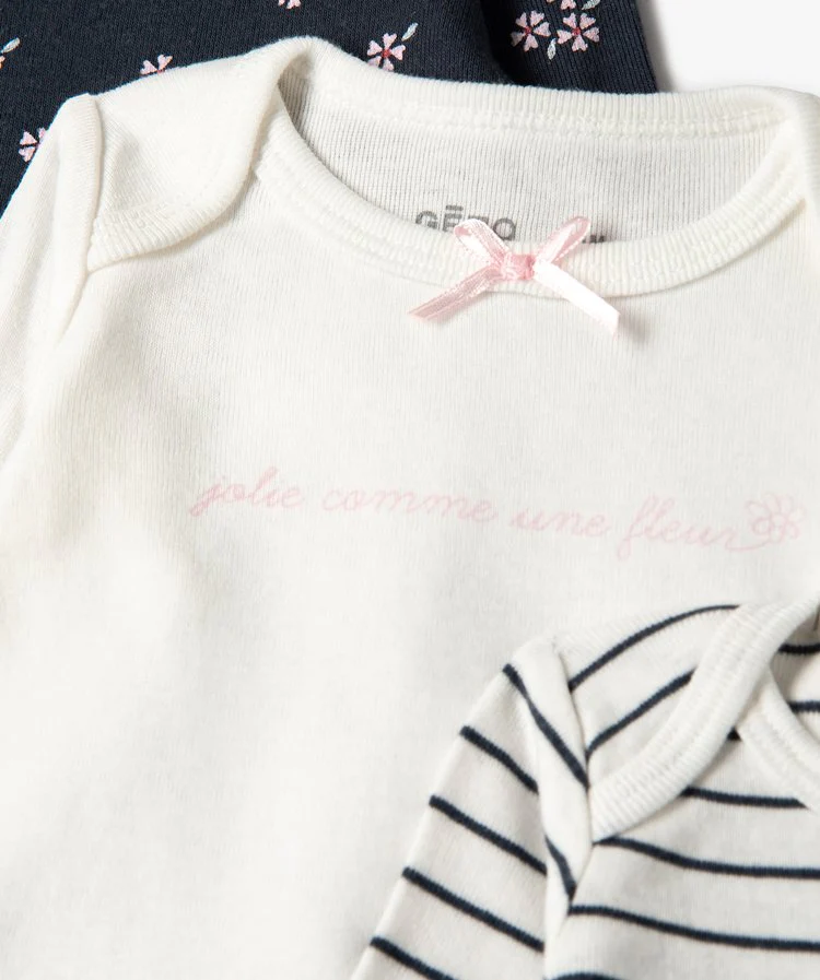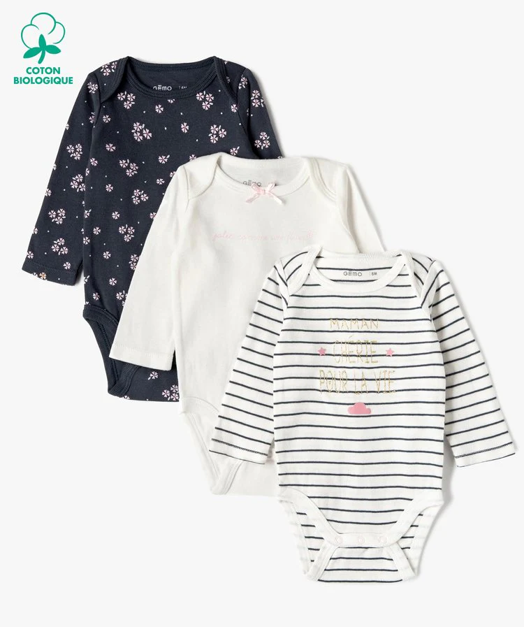 Succombez à la douceur de ces sous-vêtements bébé en coton biologique. Un lot de 3 bodies bébé fille qui assureront une parfaite protection sous tous les vêtements. Ces bodies à manches longues possèdent une encolure américaine offrant une large ouverture pour le passage de la tête. Ce lot se compose d’un body rayé avec inscriptions pailletée, d’un body avec inscription discrète et petit nœud sur le col et d’un body à motifs fleuris.