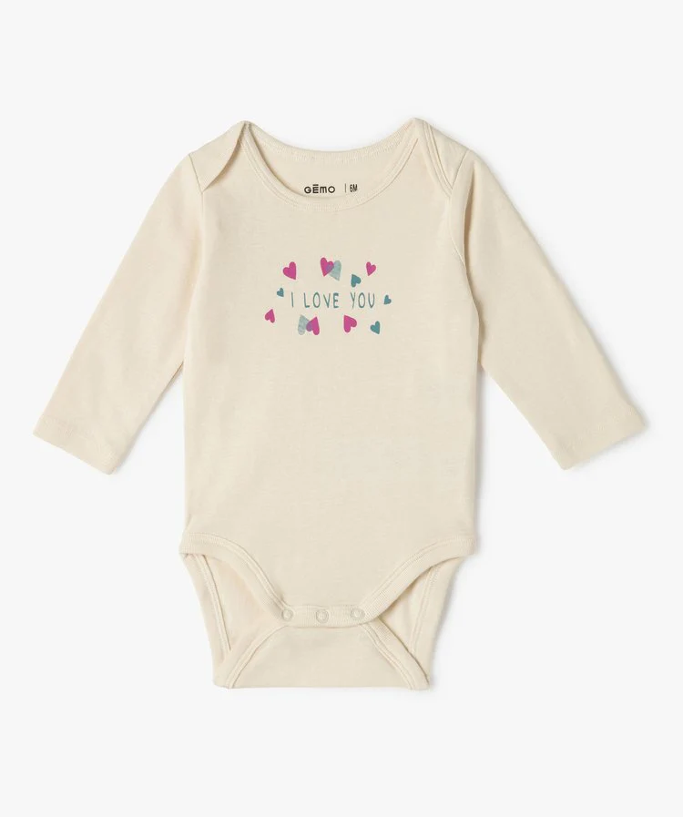 Lot de 3 bodies bébé fille décorés de motifs variés sur le thème des cœurs. Ces sous-vêtements bébé sont fabriqués en coton biologique plus doux pour la peau et plus respectueux de la planète. Le lot se compose de 3 bodies à manches longues et encolure américaine :