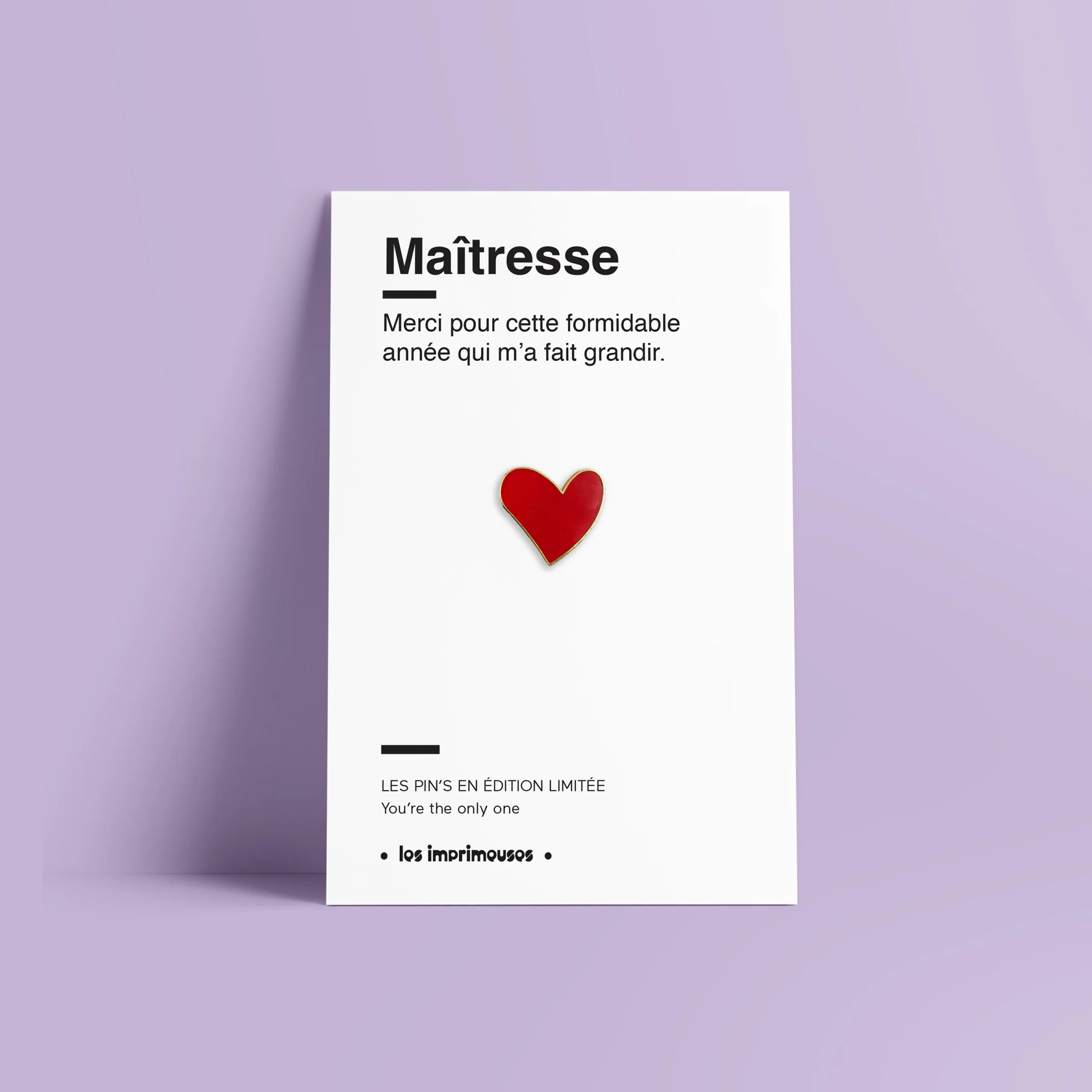 Description Pin’s émaillé en édition limitée Un joli petit coeur pour dire Merci au Maître ou à la Maîtresse en fin d’année scolaire. À porter sur un t-shirt, sur un pull ou à accrocher par milliers sur vos tote bags. Toutes les occasions sont bonnes pour collectionner les pin’s numerotés Les Imprimeuses. Détails Taille 3 […]