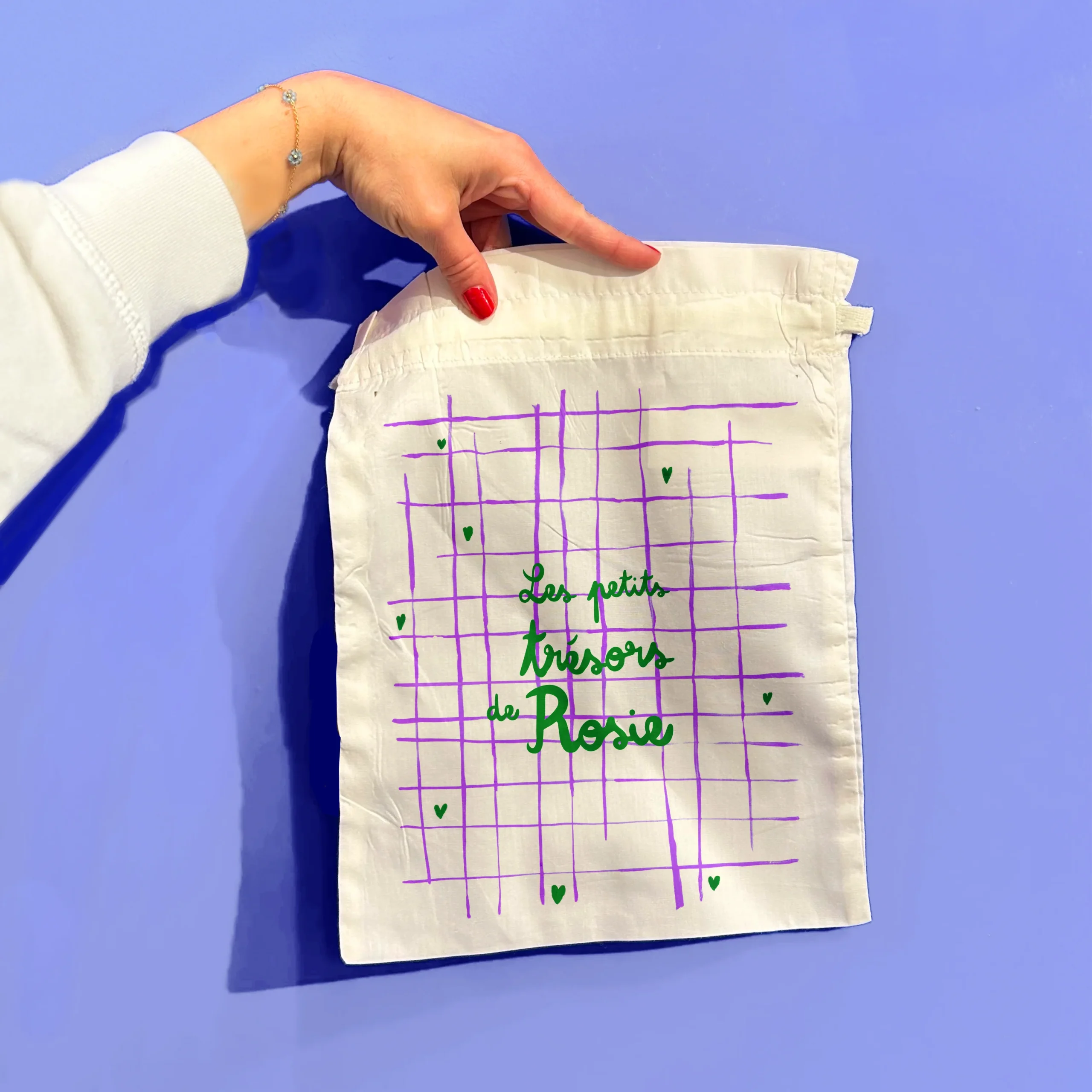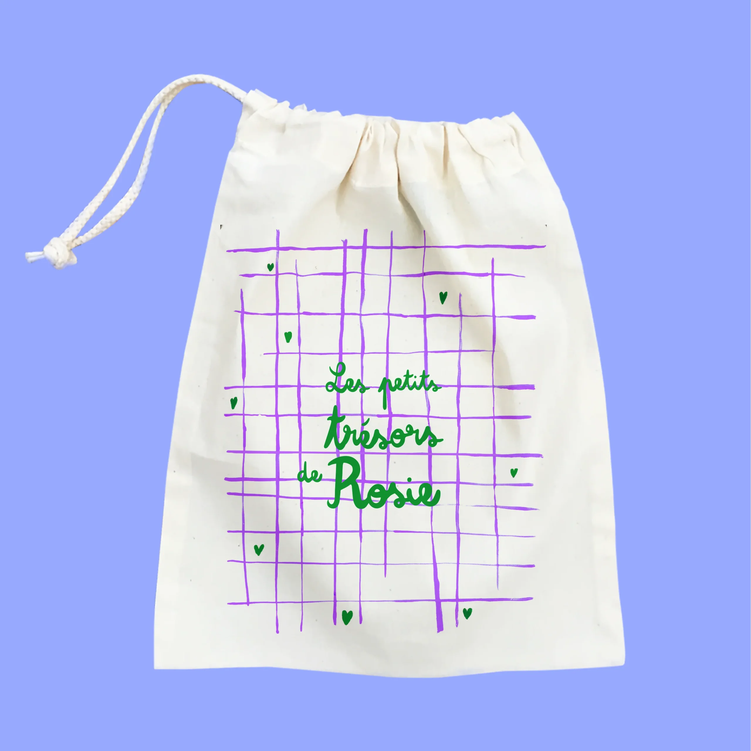 Un petit pochon personnalisé au prénom, dessin réalisé à la gouache et écriture à la main.