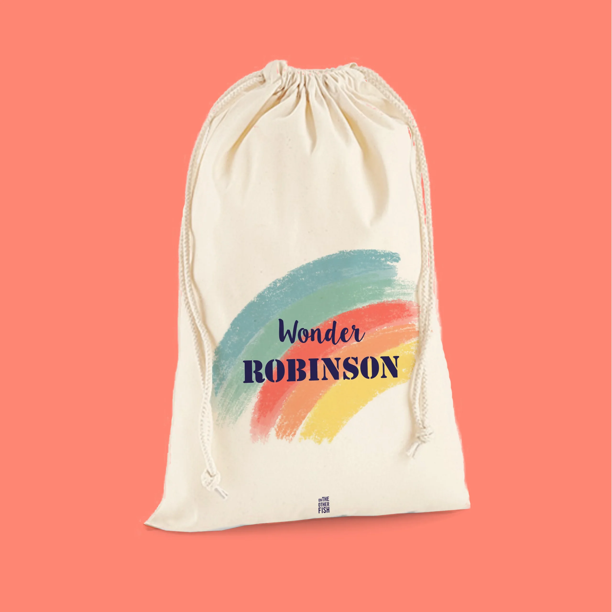 Une pochette à personnaliser aux couleurs de l’arc en ciel parce que vous êtes magique ! Dimensions Petite pochette : 25cm x 30cmGrande pochette : 30cm x 45cm Poids 33g Matière 100% coton Entretien Lavage en machine à 30° Thème Enfant