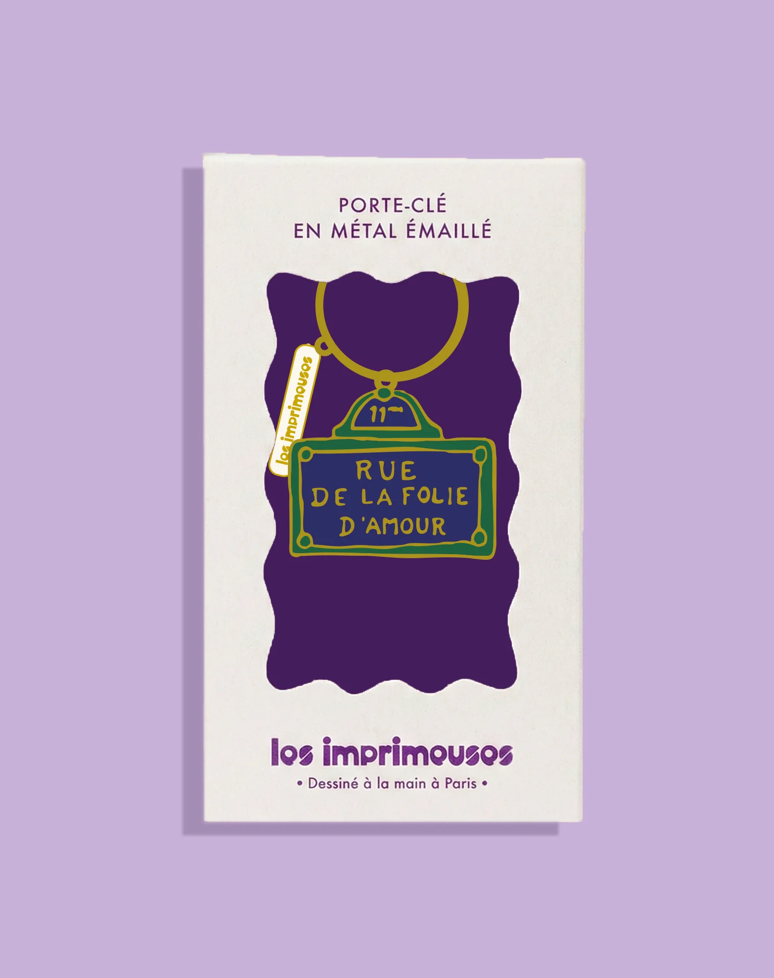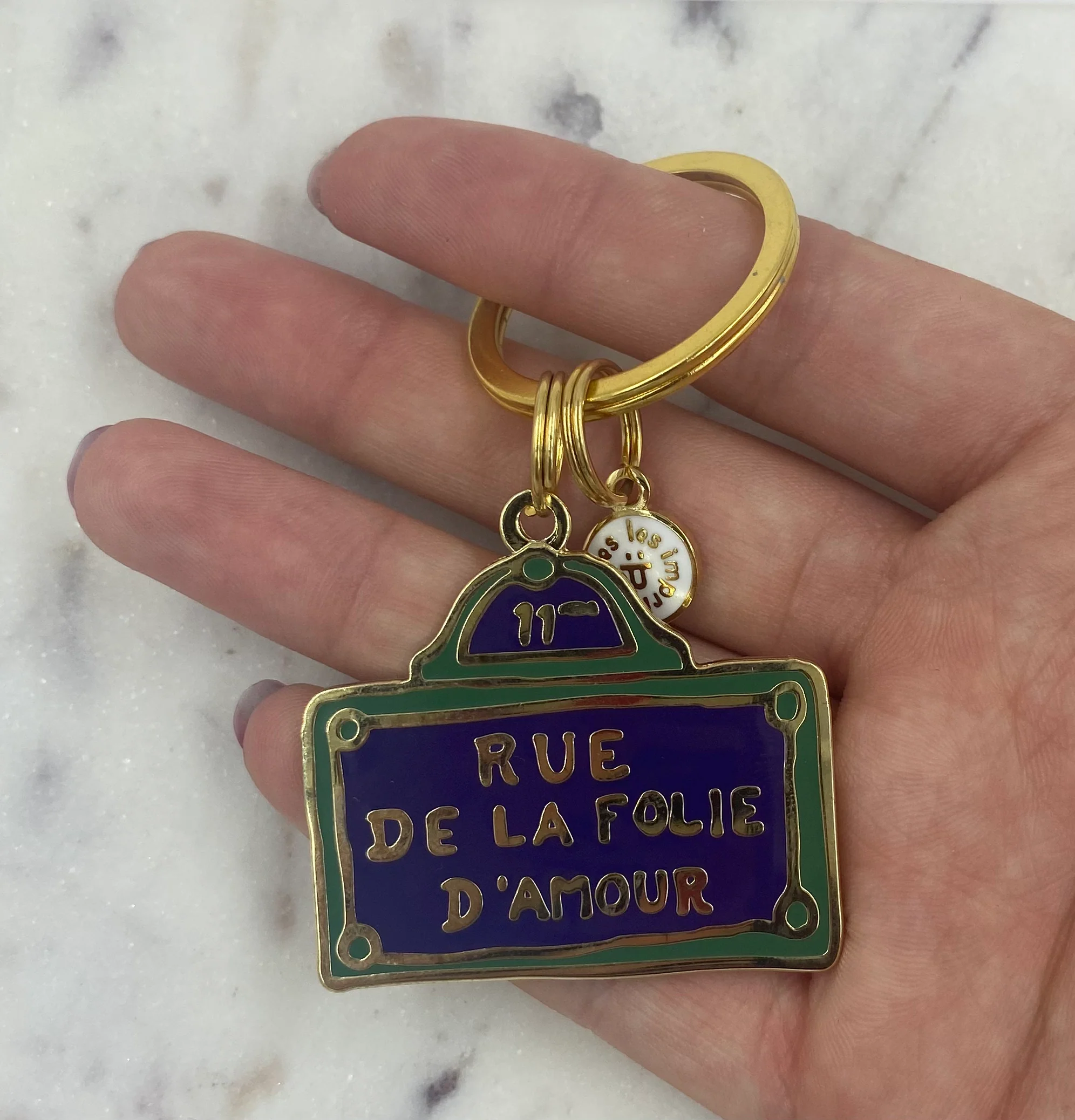 Ce porte-clé “Rue de la Folie d’Amour” ajoute une touche romantique et malicieusement parisienne à vos clés, à un sac ou à une trousse. Un clin d’œil tendre, facile à offrir et à garder près de soi.