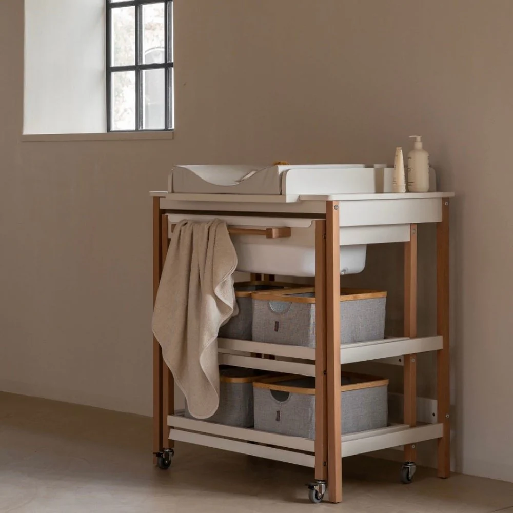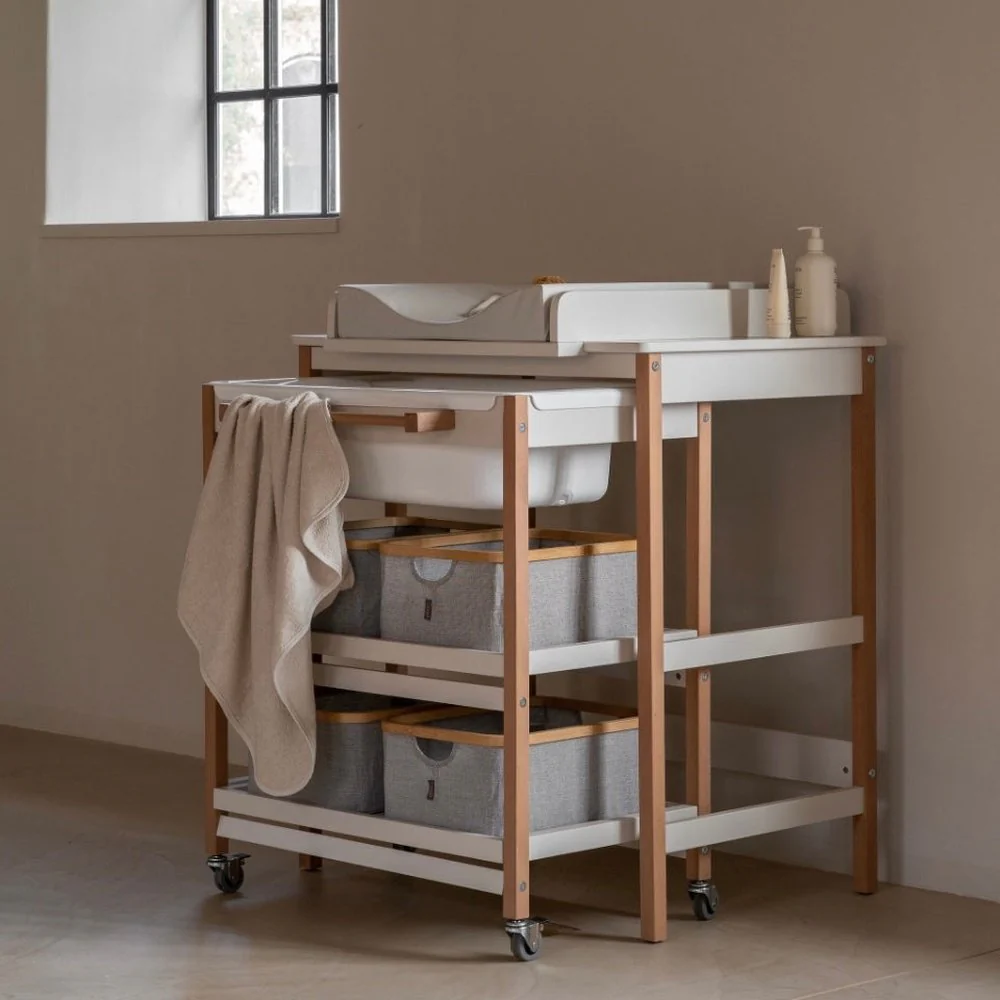 Grâce à la roulettes sous les pieds tu fais simplement glisser la baignoire et la table à langer l’une de l’autre. Après utilisation, tu les replis soigneusement en un seul meuble compact – idéal pour les petits espaces ou pour ceux qui aiment l’ordre.