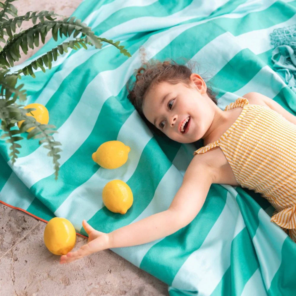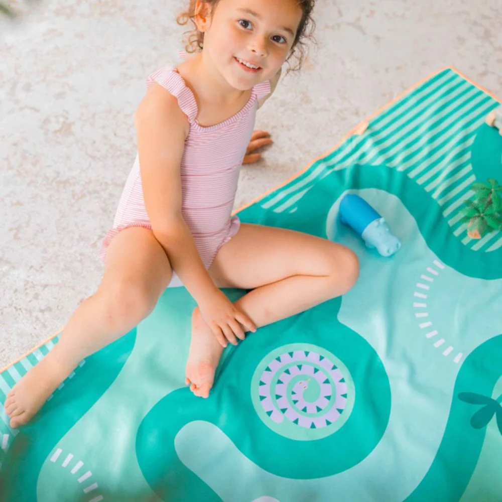Délicieux moments de jeu sur la plage, dans le jardin ou à la piscine. Les serviettes de Quut sont à la fois serviette de bain et tapis de jeu !