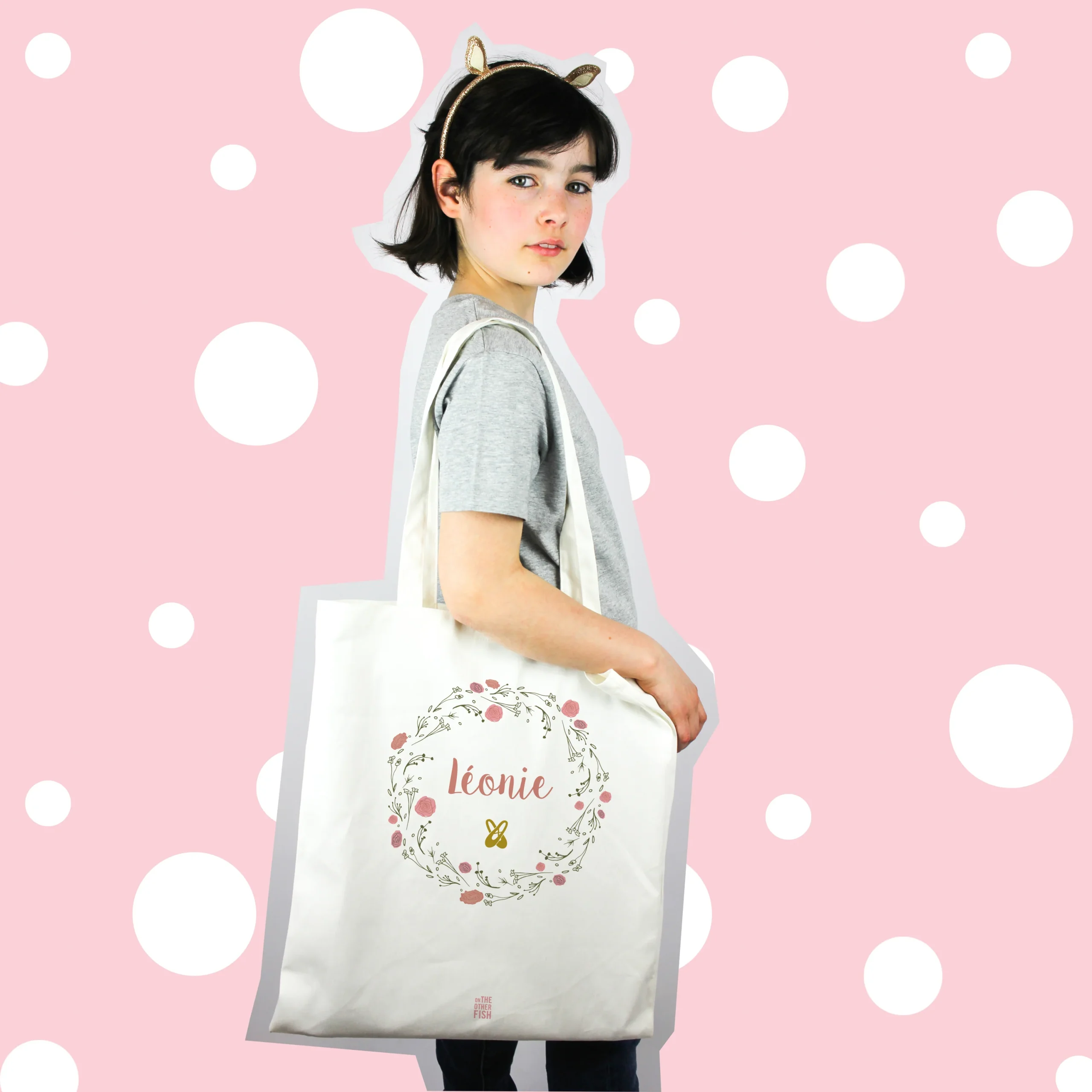 Pour le sac de danse de votre enfant, nous avons pensé à une élégante couronne de fleur rose pastel, pour qu’elle virevolte comme une belle pivoine ! Ce Tote bag 100% coton est à personnaliser au prénom de votre choix !