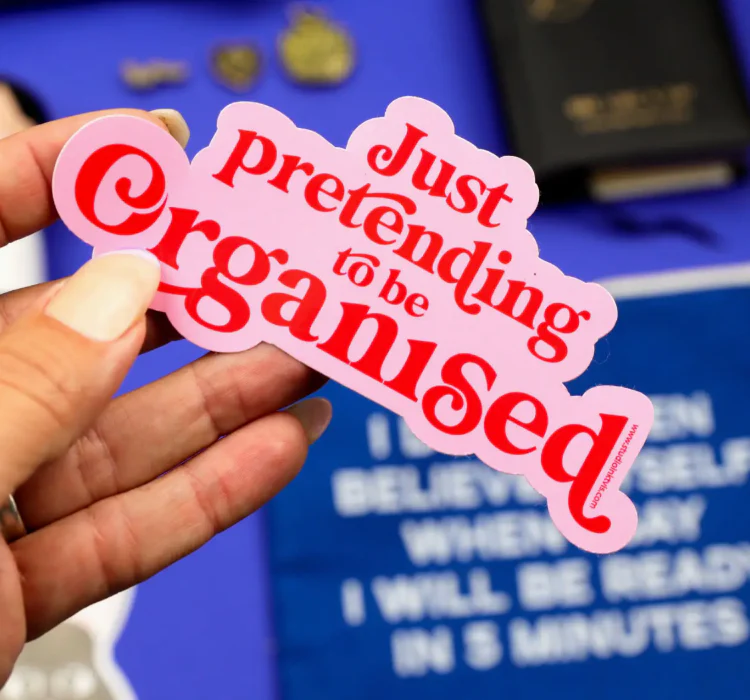 Sticker Just pretending to be organized is a fun vinyl sticker for water bottles, laptop, bicycle, phone and much more. This decal is printed on 90 micron gloss vinyl with weather resistant inks. Lifespan is therefore at least 3 years for outdoor use only. The sticker is suitable to give as a gift to your friends or acquaintances.