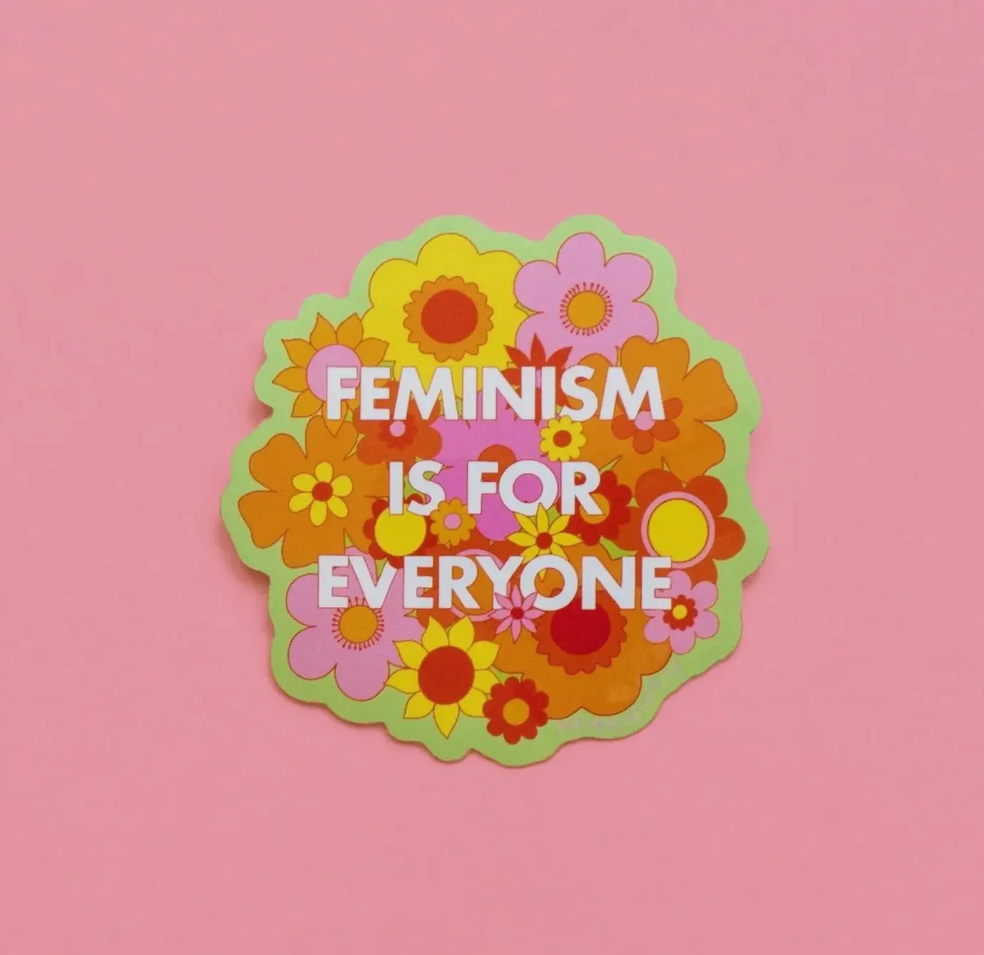 Autocollant vinyle brillant et imperméable avec des fleurs orange et le texte « Le féminisme est pour tout le monde ».
