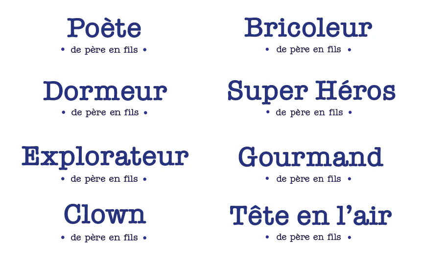 l est aussi maladroit que son papa ? Il est aussi globe trotteur que sa fille ? Il est fier d’avoir des filles / des fils aussi gourmandes que lui ? Choisissez votre adjectif et votre genre et il sera comblé ! Matière 100% coton biologique Entretien Lavage en machine à 30° Thèmes Papa