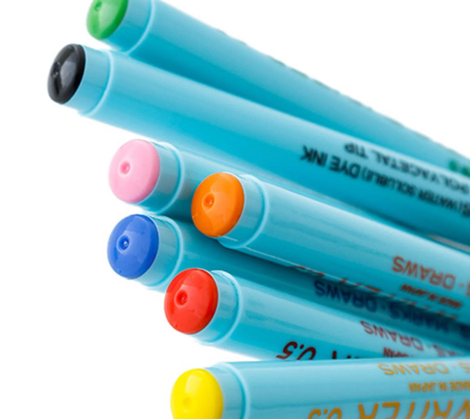 7 stylos de différentes couleurs : noir, vert, bleu, rouge, rose, orange et jaune.