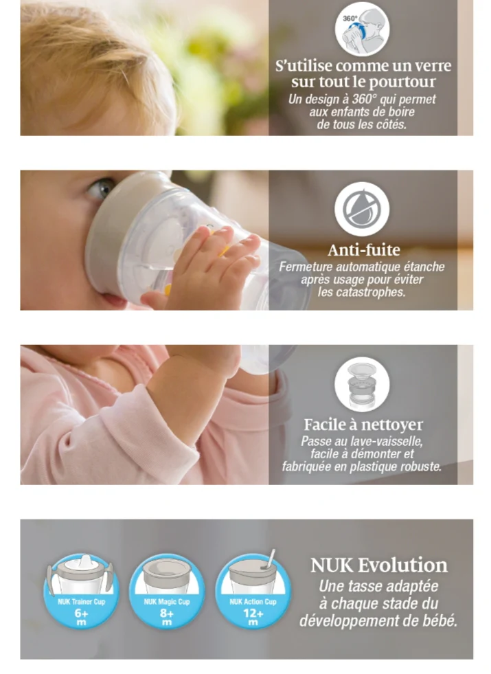 Apprendre à boire de façon autonome est l’une des étapes les plus importantes du développement d’un bébé et représente un véritable défi de patience et d‘habileté. C’est pourquoi nous avons conçu les tasses NUK Evolution – des tasses disponibles en deux tailles et avec différents accessoires qui évoluent avec l’enfant. Grâce aux nombreuses combinaisons possibles, cette gamme de tasses propose la bonne tasse pour chaque stade de développement.