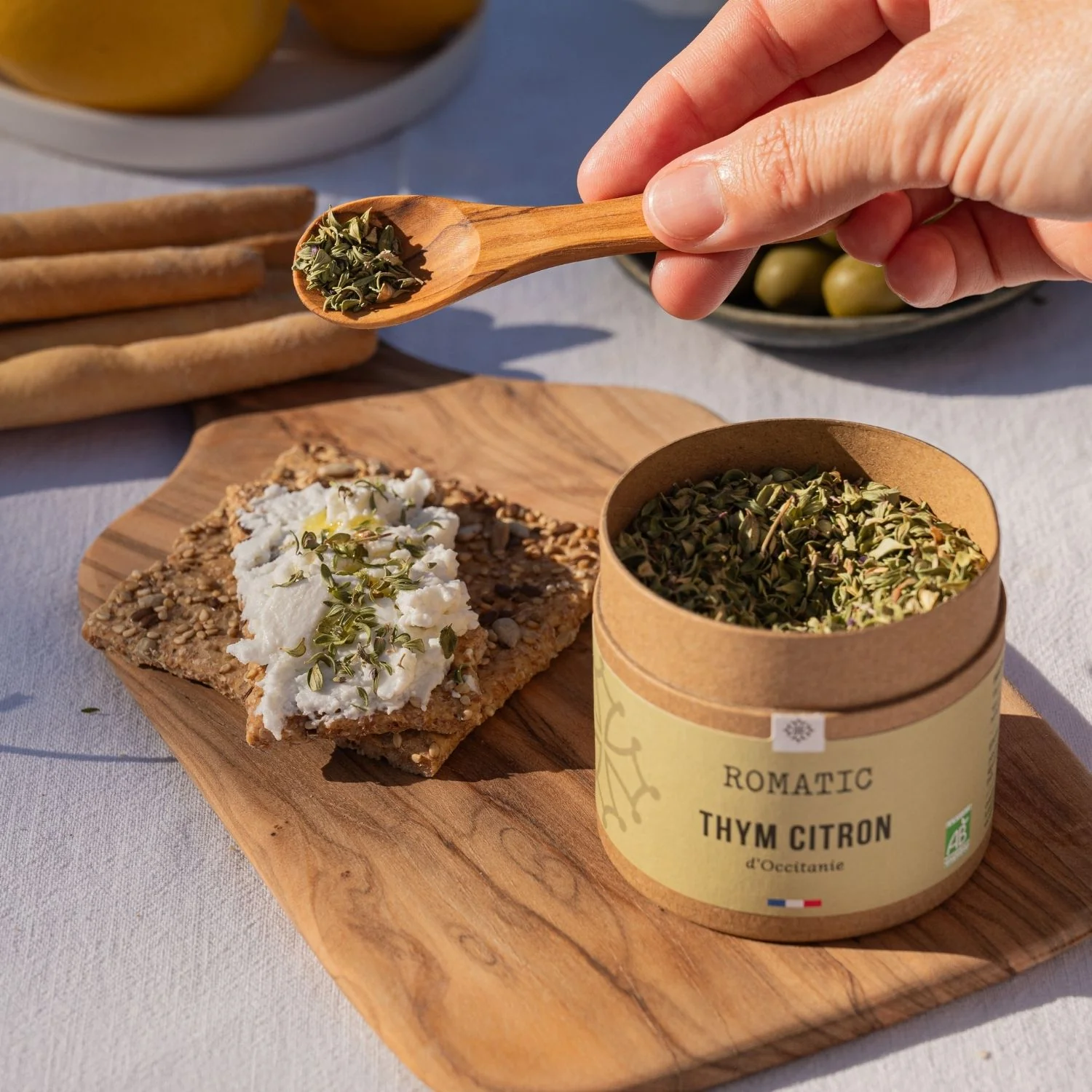 Préparé avec du thym citron Bio cueilli ici, en Occitanie, cet aromate aux notes délicieusement citronnées parfumera vos poissons, viandes, légumes, salades, tartes salées et fromages frais.