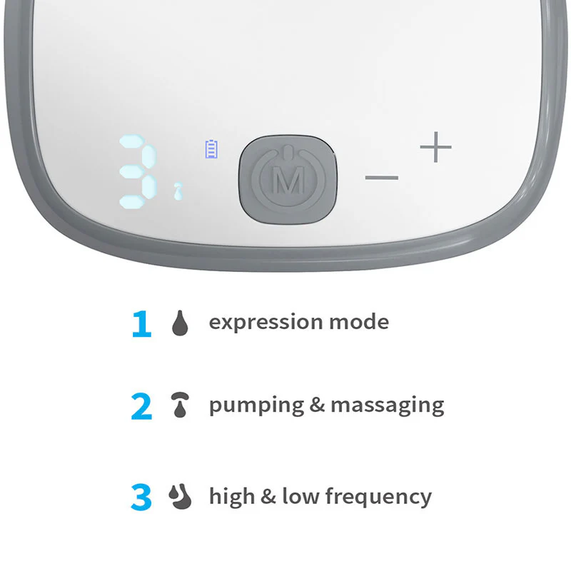 - Mode 2 en 1 – Un cycle composé de 8 mouvements de massage suivis d’1 mouvement d’aspiration. Ce mode est recommandé pour apaiser les douleurs des seins surchargés et pour stimuler les seins afin d’exprimer plus de lait en moins de temps.